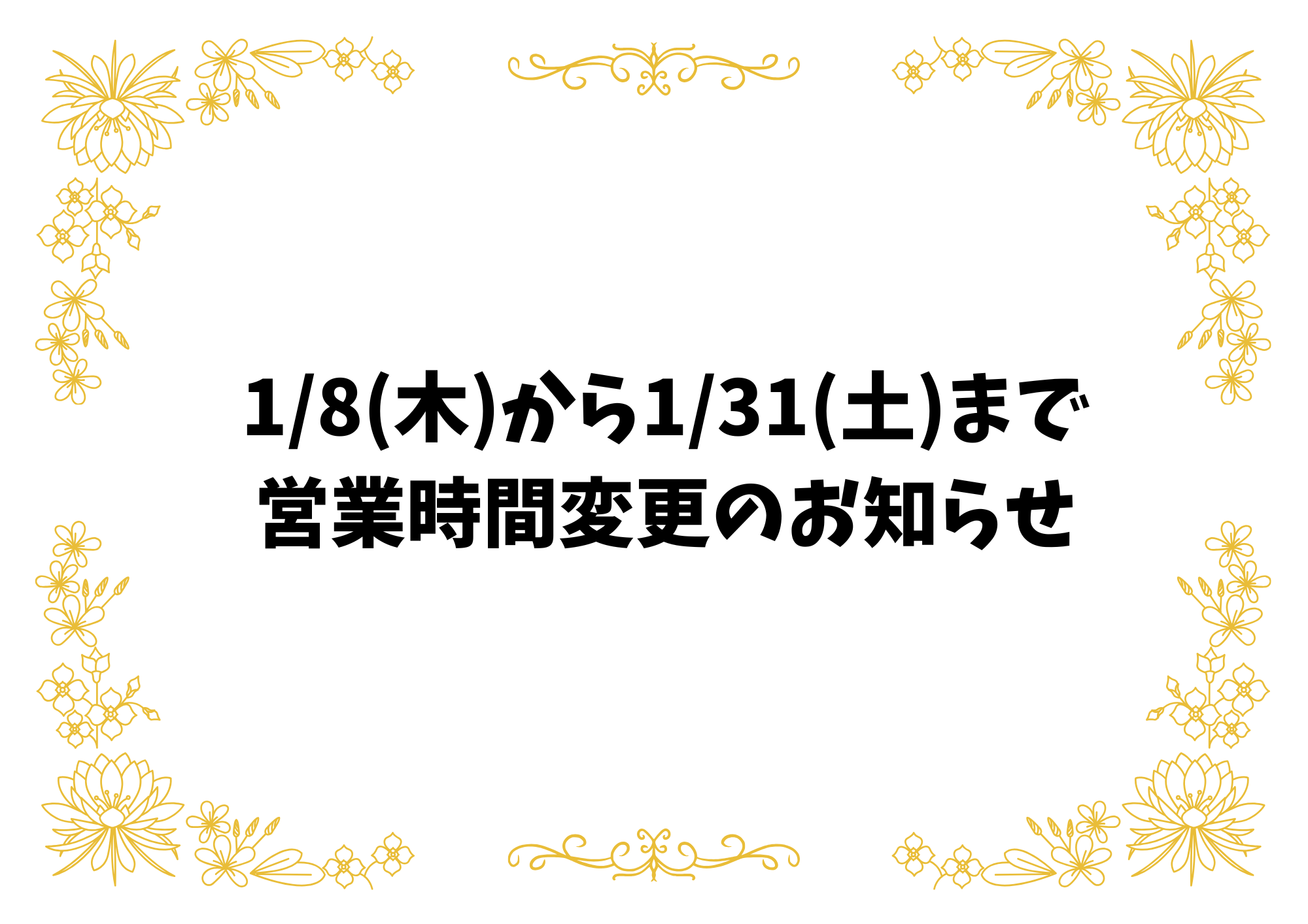 1/8(木)~営業時間変更のお知らせ 更新情報&イベント情報 2026.01.08 いつもご来店ありがとうございます。 急なお知らせで申し訳ありません。 誠に勝手ながら、1/8(木)~1/31(土)の間は、開店時間を14時 とさせて頂きます。 よろしくお願いします。
